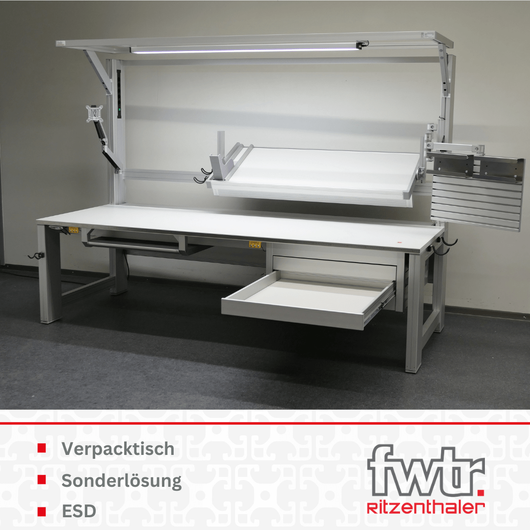 Ein breiter Arbeitstisch aus Aluprofilen mit Beleuchtung, Schubladen under einer schrägen Ablagefläche. Darunter steht Verpacktisch, Sonderlösung und ESD